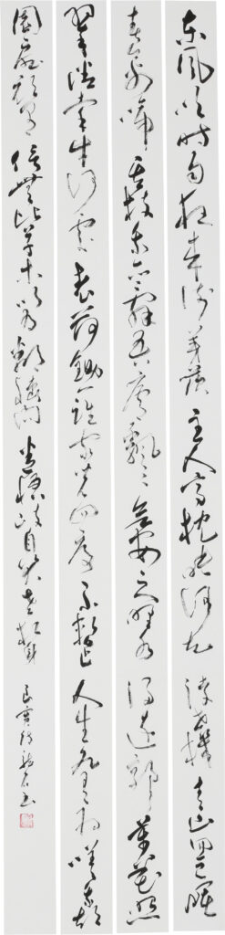 紙に正対するのではなく、右側に座って左手で筆をふるっていく。揮毫を終えて、初めて見る人に全貌がわかり、感嘆の声が上がることもしばしばだ。 数少ない左利きの書家。
