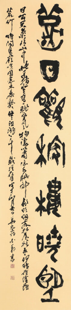 31歳で授かった長女が寝静まる夜中に筆を執り、100枚書いて師を驚かせたことも。少字数書を書いていたが、これを契機に多字数書に魅せられ、王鐸、何紹基などの臨書、かな、さらには篆書にも取り組んだ。