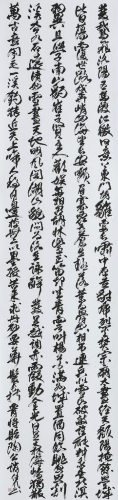 展覧会への出品も始めると、作品づくりに夢中に。「自分の思い通りに表現するのが楽しくて」と、二尺×八尺作品を一日に10本書いたことも。京展、日展を経て、産経国際書展には第25回展から出品を続けている。